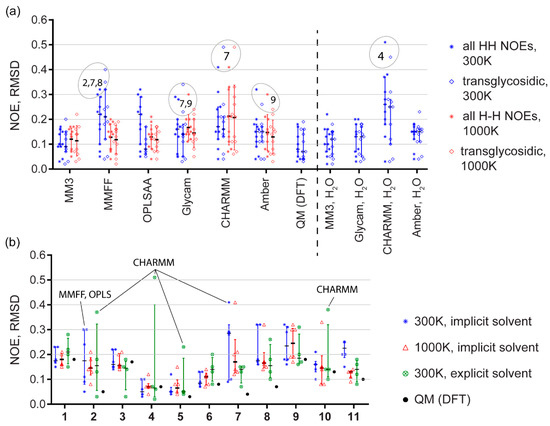 | # | Force Field | MM3 2000 | MMFF94 | OPLS aa | GLYCAM 06 | CHARMM 36 | Amber ff14SB | DFT a | NOE Reference | ||||