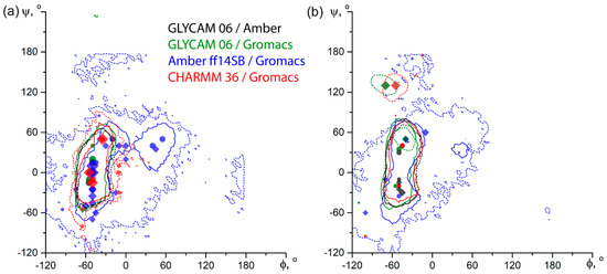 - Patel, D.S.; Pendrill, R.; Mallajosyula, S.S.; Widmalm, G.; MacKerell, A.D., Jr. Conformational properties of alpha- or beta-(1-->6)-linked oligosaccharides: Hamiltonian replica exchange MD simulations and NMR experiments. J. Phys. Chem. B 2014, 118, 2851–2871. [Google Scholar] [CrossRef]