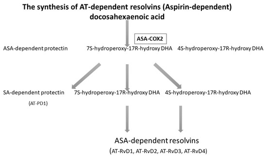 Acetylsalicylic acid (ASA), known as aspirin, acetylates cyclooxygenase-2 (COX-2) and enables the biosynthesis of precursors for anti-inflammatory mediators. Experimental studies show that, when influenced by ASA, EPA in mice is transformed into completely new products with anti-inflammatory properties. Because DHA has a cardioprotective effect, is abundantly present in the brain and the retina, and has an influence on numerous physiological processes, analyses were conducted to determine whether during inflammation, DHA was used in the treatment of ASA [37]. The analysis revealed that in mice treated with ASA and DHA, new bioactive docosanoids were formed, such as 17R-hydro(peroxy)-docosahexaenoic acid (17R-H (p) DHA), which is then transformed into resolvins D1-D4 thanks to COX-2 [37], as presented in Figure 1.