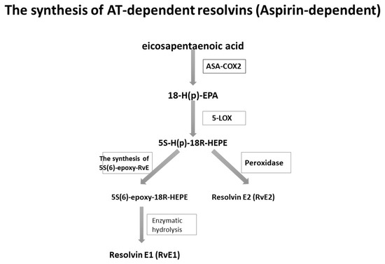 A similar observation was made in the case of the synthesis of resolvins E. In mice treated with ASA, EPA was transformed into 18R-hydro (peroxy)-eicosapentaenoic acid (18R-H (p) EPA) thanks to the capabilities of the ASA-COX-2 enzyme [39,40]. Subsequently, this acid, in conjunction with 5-LOX, underwent further transformations into resolvins E, as presented in Figure 2.