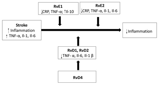 It has been proven that resolvin E1 (RvE1) significantly decreases inflammation and the migration of neutrophils, activating the resolution of inflammation [38]. Moreover, it decreases the release of pro-inflammatory cytokines, mainly interleukins (Il-1, Il-6, Il-12, Il-17, and Il-23). One of the most studied cytokines in the cerebrospinal fluid and blood of stroke patients is the proinflammatory IL-6 [38,39,40]. However, there is still not many data on the mechanism of pro-inflammatory cytokines’ activities in the early stage of stroke (4–6 h after the induction of experimental stroke). It is known that TNF-α, Il-1, and Il-6 increase in amount, even 40–60 times, within 24 h after a stroke [40]. Apart from the decrease in the release of pro-inflammatory cytokines, resolvin E1 also inhibits inflammatory angiogenesis and stimulates phagocytosis through macrophages. The strong anti-inflammatory activity of this resolvin was also observed in an in vivo study that focused, among others, on the kidney damage caused by ischemia, the decrease of inflammation in white adipose tissue (in mice), the reduction of fatty liver, and the improvement of insulin sensitivity. Studies show a strong protective effect of resolvins E not only in the circulatory system, but also in the respiratory system, where they facilitate apoptosis, promoting the resolution of respiratory tract inflammation caused by contact with an allergen [41]. It is also known that resolvin E2 (RvE2) is characterised by weaker anti-inflammatory activity in comparison to RvE1, but it still has a positive impact on phagocytosis, the regulation of the functioning of integrins located on the leukocyte surface, facilitating their migration to the site of inflammation, and also limiting the recruitment of granulocytes. Moreover, it has an influence on the production of the interleukin-10 (Il-10) anti-inflammatory cytokine by macrophages [42]. Il-10 is an anti-inflammatory cytokine that inhibits the expression of pro-inflammatory cytokines and regulates the innate immune response. In studies conducted on rats, Il-10 decreased the scope of ischemic stroke and the damage caused by cerebral artery obstruction [43]. It has also been demonstrated that lower levels of Il-10 are associated with an increased risk of stroke [44].