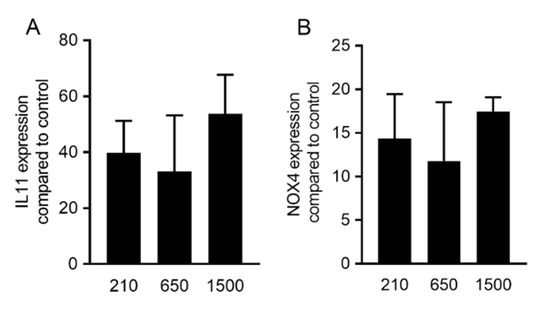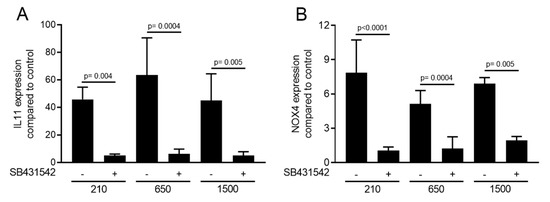 All experiments were performed three to five times. Bars show the mean and standard deviation of the cumulative data from the means of independent experiments. Statistical analysis of the IL11 and NOX4 expression and immunoassay was performed with ANOVA and post-hoc Fischer’s LSD test for multiple comparisons. An ANOVA and post-hoc Fischer’s LSD test for multiple comparisons compared all groups with each other. Analyses were performed using Prism v8 (GraphPad Software, La Jolla, CA, USA). Significance was set at p < 0.05.