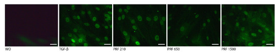 PRF lysates prepared at 210 g, 650 g and 1500 g provoked nuclear translocation of Smad2/3. Gingival fibroblasts were exposed for 1 h to 30% of the PRF lysates prepared at different g-forces. Immunofluorescence revealed the nuclear translocation of Smad2/3 by all variants of PRF lysates compared to the untreated control. Scale bars are 100 µm. The Figure is representative for three independent experiments.