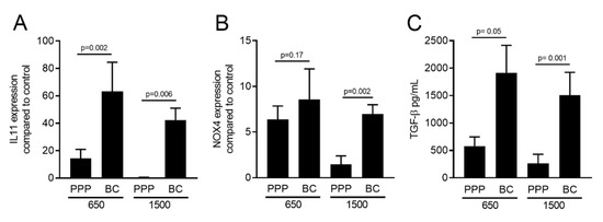 The buffy coat (BC) fraction has significantly more TGF-β activity compared to platelet-poor plasma (PPP) in PRF 1500 g and 650 g. Gingival fibroblasts were exposed to 30% of lysates from PPP and BC layers of PRF prepared at 650 g and 1500 g. Analysis of gene expression changes revealed that IL11 (A) was upregulated significantly in the BC layer of PRF prepared at 1500 g and 650 g, and the NOX4 (B) gene was upregulated in the presence of all variants of PRF lysates. Statistical analysis showed no significant differences (p > 0.05) between the PPP and BC layers in NOX4 gene expression. These observations suggest that the BC layer has more TGF-β activity compared to the uppermost PPP layer (n = 6). Concentration of active TGF-β in the BC and PPP fractions of PRF prepared at 1500 g and 650 g was evaluated by immunoassay (C). Data represent the mean and standard deviation. TGF-β is indicated in pg/mL. Statistical analysis was conducted using ANOVA (n = 6).