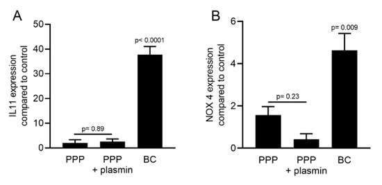 The plasmin-digested PPP fraction at 1500 g did not increase TGF-β target genes expression. Gingival fibroblasts were exposed to 30% of the BC and PPP fraction of PRF lysates prepared at 1500 g and the plasmin-digested PPP fraction. Gene expression analysis indicated that plasmin digestion is not sufficient for PPP to make changes in the expression of IL11 (A) and NOX4 (B). Data represent the mean and standard deviation of three independent experiments. Statistical analysis was performed using ANOVA (n = 3).