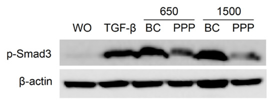 In support of the activation of TGF-β receptor signaling mainly by BC and not PPP, phosphorylation of Smad3 was evaluated. Gingival fibroblasts were exposed to 30% of the BC and PPP fractions of PRF lysates prepared at 650 g and 1500 g for 16 h. Western blot indicated that BC fractions of PRF lysates prepared at 650 g and 1500 g provoked an increased phosphorylation of Smad3. In contrast, PPP fractions failed to generate a similar response (Figure 8).