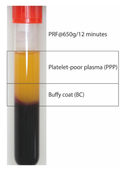 PRF was prepared after the approval of the Ethics Committee of the Medical University of Vienna (1644/2018) and volunteers signed informed consent. All experiments were performed in accordance with relevant guidelines and regulations. For preparation of PRF lysates, venous blood was collected at the University Clinic of Dentistry from six healthy volunteers in glass-coated tubes (BD vacutainer, BD368045, Plymouth, UK) and centrifuged at 210 g, 650 g (Figure 9) and 1500 g for 12 min (Z 306, Hermle, Universal Centrifuge, Wehingen, Germany) with universal swing-out rotors (146 mm at the max). The PRF clot was separated from the remaining red thrombus and compressed between two layers of dry gauze. Each PRF membrane was transferred into serum-free medium (1 cm PRF/mL) and exposed to two cycles of freeze-thawing and sonication (Sonopuls 2000.2, BANDELIN electronic, Berlin, Germany). The lysate was subjected to centrifugation at 15,000 g for 10 min and the respective supernatant was filtered sterile and stored at −20 °C before the in vitro analysis [36,37,38]. Exclusively, PRF membrane prepared at 1500 g and 650 g (Figure 9) were also cut into two pieces closed to the border (buffy coat; BC) and in the most upper part (platelet-poor plasma; PPP) of the membranes. For indicated experiments, the 1500 g PPP membrane was incubated with 5 nM plasmin (Sigma-Aldrich, St. Louis, MO, USA.) in Tris-HCl 50 mM (pH = 7.4) [39]. Following fibrinolysis at 37 °C for 4 h, the reaction was terminated by heating at 65 °C for 15 min before centrifugation and sterile filtration was performed.