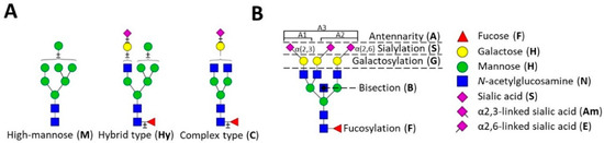 N-glycan structural features. The three major classes of human N-glycans are schematically presented (A) and the major structural features of complex-type N-glycans are introduced (B). Adaptation from [19].