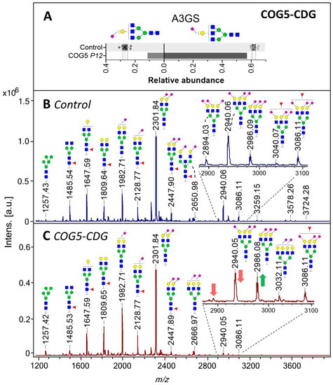 Total plasma N-glycome (TPNG) of a COG5-CDG patient. (A) Levels of α2,3-sialylation per galactose (left) and α2,6-linked sialylation per galactose (right) on triantennary glycans (A3GS) of TPNG. The box plot shows the median (dashed line) with the interquartile range (dotted lines) for healthy controls (n = 10) whilst the bars give the values determined for the COG5-CDG patient. (B) and (C) show the TPNG MALDI-TOF-MS profiles of healthy control 5 and the COG5-CDG patient, respectively. All glycans were detected as [M+Na]+. For glycan annotation see Figure 1.