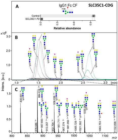 CDGs are rare and complex to diagnose as case severity and disease symptoms can vary. Conventional clinical diagnostic techniques include screening for glycosylation defects by transferrin isoelectric focussing (TIEF) [6,7]. Recent advances in the field include the implementation of mass spectrometric analysis of the abnormal glycan structures attached to transferrin (Tf) to support diagnosis [8,9,10]. Specific Tf glycosylation patterns driven by (abnormal) glycan structure abundances often correlate with very specific defects of e.g., nucleotide sugars or enzymes in the biosynthetic pathway. While the inclusion of Tf glycosylation analysis in clinical routine has been crucial to decipher many of the unresolved cases of CDG [11], this protein only displays a limited set of N-glycans and mainly reflects the physiological status of the liver. For some CDGs, such as MOGS-CDG, transferrin glycosylation was shown to be normal, while IgG glycosylation showed characteristic glycosylation abnormalities [12].