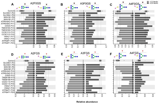 Total plasma N-glycome (TPNG) structural features determined for CDG patients. Levels of α2,3-sialylation per galactose (left) and α2,6-linked sialylation per galactose (right) are displayed for non-fucosylated (A) diantennary, (B) triantennary and (C) tetraantennary glycans as well as for fucosylated (D) diantennary, (E) triantennary and (F) tetraantennary glycans. The box plot shows the median (dashed line) with the interquartile range (dotted lines) for healthy controls (n = 10) whilst the bars give the individual values determined for the CDG patients.