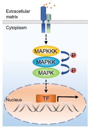 In plants, gene expression is strictly regulated through complex networks of signaling pathways to modulate developmental processes and responses to environmental stresses. Mitogen-activated protein kinases (MAPKs) are a group of Ser/Thr protein kinases that were originally characterized as being involved in transmitting extracellular signals into the nucleus through signaling cascades []. Generally, a MAPK cascade consists of three kinases, a MAPK kinase kinase (MAPKKK), a MAPK kinase (MAPKK) activated by a MAPKKK, and a MAPK (hereafter named MPK) that is phosphorylated by a MAPKK [] (Figure 1). MAPK cascades have been found in all eukaryotes []. For example, the grape (Vitis vinifera) genome possesses 88 MAPK cascade genes, including 7 MAPK kinase kinase kinases (MAPKKKKs), 62 MAPKKKs, 5 MAPKKs, and 14 MPKs []. The Arabidopsis (Arabidopsis thaliana) genome encodes 80 MAPKKKs, 10 MAPKKs, and 20 MPKs [,].