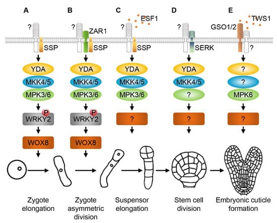 Some reports showed that RLKs are important regulators genetically upstream of canonical MAPK signaling cascades in controlling embryogenesis in plants. The sperm-originated and membrane-associated receptor-like cytoplasmic kinase (RLCK) SHORT SUSPENSOR (SSP) was reported as an upstream regulator of YDA in controlling elongation and asymmetric division of the zygote []. The ssp mutant shows similar but weaker embryonic defects when compared to the yda mutant, and hyperactive YDA can restore the suspensor phenotype of the ssp mutant []. Recent studies revealed that SSP genetically and biochemically interacts with YDA, and paternal SSP signaling activates the YDA-MPK3/6 cascade [,]. Defective zygote elongation and asymmetric division similar to ssp, yda and mpk3/6 were also observed in the mkk4/5 double mutant [,], indicating that MKK4/5 are key components in the SSP-YDA signaling pathway. All these findings demonstrate that SSP functions upstream of the YDA-MKK4/5-MPK3/6 cascade to regulate zygote polarity, elongation and asymmetric division (Figure 2A,B).