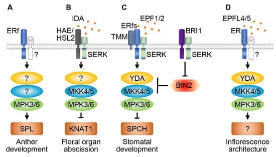 RLKs and MAPK cascades regulate reproductive and stomatal development. ERECTA family (ERf) members and MPK3/6 modulate anther development via activating the transcription factor SPOROCYTELESS (SPL) (A). HAESA/HAESA-like 2 (HAE/HSL2) and coreceptor SERKs perceive the INFLORESCENCE DEFICIENT IN ABSCISSION (IDA) peptide signal to control floral organ abscission by activating MKK4/5 and MPK3/6 (B). ERf, TOO MANY MOUTH (TMM) and SERKs form a receptor complex to sense the EPIDERMAL PATTERNING FACTOR 1/2 (EPF1/2) peptide ligands to control stomatal development and pattern via the YDA-MKK4/5-MPK3/6 cascade. BRASSINOSTEROID-INSENSITIVE 2 (BIN2) functions downstream of BRASSINOSTEROID INSENSITIVE 1 (BRI1) to repress the activity of YDA and MKK4/5 in controlling stomatal development (C). ER perceives the EPF-LIKE 4/5 (EPFL4/5) peptide signals to regulate inflorescence architecture via the YDA-MKK4/5-MPK3/6 cascade (D). ? represents the unknown RLK, MAPK or transcription factor.