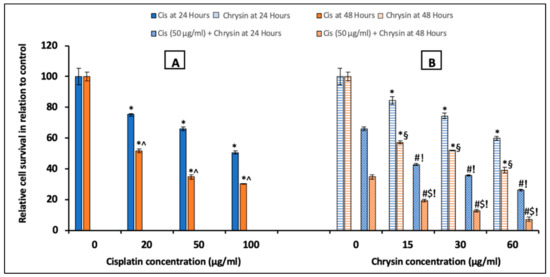 Impact of 24 and 48 h treatment with (A) cisplatin (Cis; 20, 50, 100 µg/mL), (B) chrysin (15, 30, 60 µg/mL) and combination of chrysin (15, 30, 60 µg/mL) with Cis 50 µg/mL on cell survival in HepG2 cells. Results are presented as Mean ± SD. * p < 0.05 versus the control untreated cells. ^ p < 0.05 versus the same dose of Cis treatment for 24 h. # p < 0.05 versus the same dose of chrysin at the same incubation time. ! p < 0.05 versus Cis 50 µg/mL at the same incubation time. § p < 0.05 versus the same dose of chrysin treatment for 24 h.$ p < 0.05 versus cis 50 µg/mL + the same dose of chrysin treatment for 24 h.