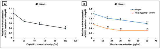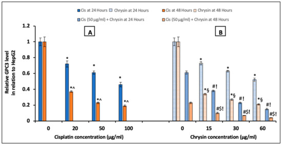 On the mRNA level, HepG2 cells treated with cisplatin (20–100 µg/mL) (Figure 4A) or chrysin (15–60 µg/mL) (Figure 4B) for 48 h demonstrated a significant dose-dependent downregulation in GPC3 mRNA expression compared to the control untreated HepG2 cells. Moreover, co-treatment of chrysin (15–60 µg/mL) augmented the action of 50 µg/mL cisplatin on the downregulation of GPC3 mRNA expression in HepG2 cells when compared with Cis 50 µg/mL alone (p < 0.05, Figure 4B).