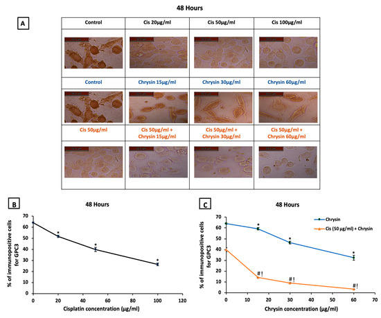 (A) Representative images of glypican-3 (GPC3) immuno-staining in HepG2 cells following treatments with cisplatin (Cis; 20, 50, 100 µg/mL), chrysin (15, 30, 60 µg/mL) and combination of chrysin (15, 30, 60 µg/mL) with Cis 50 µg/mL for 48 h, scale bar = 50 µm. Control untreated cells showed strong GPC3 immunopositive stain, Cis (20, 50, 100 µg/mL) treated cells showed mild GPC3 immunopositive stain, chrysin (15, 30, 60 µg/mL) treated cells showed GPC3 moderate immunopositive stain while, Cis 50 µg/mL + (15, 30, 60 µg/mL) treated cells showed weak GPC3 immunopositive stain. (B) Statistical analysis of the % of immunopositive cells for GPC3 after treatment with cisplatin (Cis; 20, 50, 100 µg/mL) for 48 h, (C) chrysin (15, 30, 60 µg/mL) as well as chrysin (15, 30, 60 µg/mL) and Cis 50 µg/mL combination for 48 h. * p < 0.05 versus the control untreated cells. # p < 0.05 versus the same dose of chrysin. ! p < 0.05 versus Cis 50 µg/mL. Figures for the control group in the upper and middle lanes and for the Cis 50 µg/mL group in the upper and last lanes are identical to unify the reference groups in the statistical analysis.