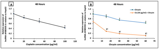 Next, we examined if the antiproliferative action of chrysin and cisplatin on HepG2 cells involved the lncRNA-AF085935. As shown in Figure 7, HepG2 cells were treated with increasing concentrations of cisplatin (20, 50, 100 µg/mL) (A) or chrysin (15, 30, 60 µg/mL) (B) for 48 h. Except for chrysin 15 µg/mL, chrysin or cisplatin single treatment significantly reduced the lncRNA-AF085935 expression in a dose-dependent manner compared with the control untreated HepG2 cells. Furthermore, lncRNA-AF085935 expression was significantly downregulated by both chrysin (15–60 µg/mL) and cisplatin 50 μg/mL as a combination treatment when compared with chrysin (15–60 µg/mL) alone or cisplatin 50 µg/mL (p < 0.05, Figure 7B).