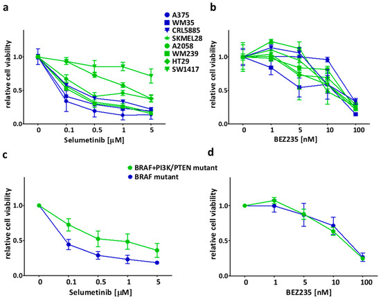 Short term (72 h) effect of selumetinib and BEZ235 on the cell viability (SRB assay). (a,b) Selumetinib was more effective on BRAF mutant cell lines (blue) than on BRAF + PI3K/PTEN mutant cell lines (green). After treatment with BEZ235, sensitivity difference was not detected in the mutational groups. (c,d) Average cell viability upon treatment with selumetinib or BEZ235 in the two mutational groups. Data is shown as mean ± SEM from at least three independent experiments.