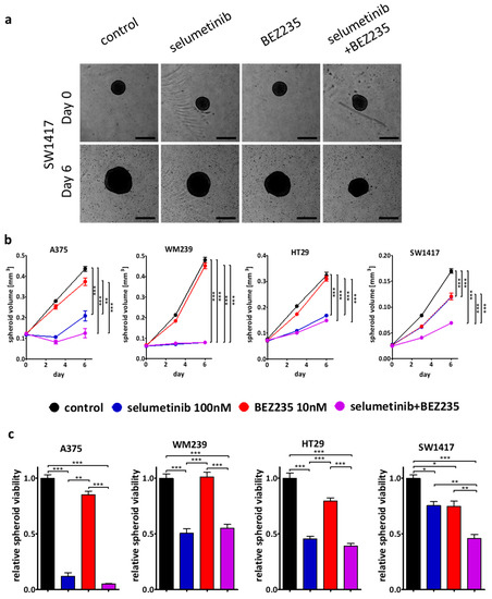 In order to validate our 2D findings in spheroid models, the cell lines with synergism in the combination treatments (WM239, SW1417; CI < 1) and two cell lines with only additive effects (A375, HT29, CI ≈ 1) were selected for three-dimensional experiments. Representative pictures demonstrate the effect of the treatments (Figure 4a and Figure S2). The volume growth of the spheroids was significantly inhibited upon treatment with selumetinib and selumetinib + BEZ235 in all four cell lines (Figure 4b). The combination seemed to be slightly more effective than the single selumetinib treatment in A375 and HT29 spheroids. Importantly, in SW1417, the combination treatment was significantly more effective when compared to the single treatments. Furthermore, CCK8 viability measurement confirmed the spheroid volume results (Figure 4c).
