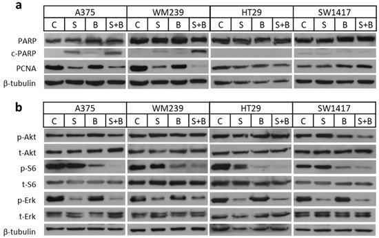 Western blot analysis was performed for 48 h to detect apoptosis induction and proliferation change upon treatment with selumetinib, BEZ235, or combination (Figure 5a and Figure S3a,b). Based on the increased cleaved PARP level, selumetinib and combination therapy were able to induce apoptosis in case of A375 and WM239. Interestingly, PARP cleavage was not present upon treatment in the SW1417 and HT29 lines. Furthermore, PCNA level decreased upon treatment with selumetinib or with the combination in A375 and WM239 cell lines but not in SW1417 and HT29 cells. Additionally, we analyzed the cell cycle distribution by image cytometry after treatments. We found an increased proportion of cells in the subG1 phase indicating apoptosis induction after selumetinib and combination treatments in the A375 cell line (Figure S4a). Furthermore, in WM239, the ratio of cells in S and G2/M phase clearly decreased by the same treatments. Importantly, while we could not demonstrate apoptosis induction by PARP cleavage or cell cycle distribution changes in the HT29 and SW1417 cells, the total cell number was strongly reduced and particularly after the combination treatment (Figure S4b). To investigate the activation of the two signaling cascade, further immunoblot assays were performed for the phosphorylation of Akt, S6, and Erk proteins (Figure 5b and Figure S3c–f). A decrease in p-S6 level was measured after BEZ235 and combination treatments; however, a significant change was detected only in the combination. Erk activation decreased especially upon treatment with selumetinib or combination, however, it was significant only in the SW1417 cells. Interestingly, Akt activation did not changed upon any treatments, except for the SW1417 cell line, where p-Akt level decreased after treatment with BEZ235 and was significantly reduced with the combination treatment.