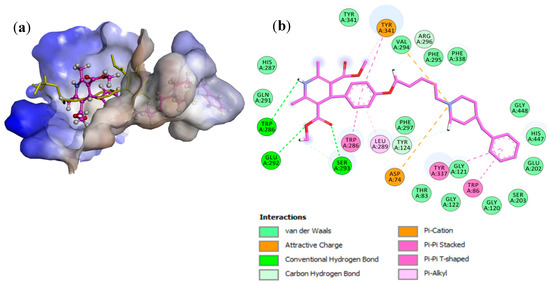 The results show that 3h was quite strongly bound with the optimal conformation of AChE, and its binding energy reached −10.3 kcal/mol. The whole molecule of 3h entered the binding pocket of AChE in a linear mode, and the benzyl piperidinium moiety was inserted into the interior of the pocket (Figure 1 and Figure 2a). Due to the large molecular size, it could completely occupy the entire cavity (Figure 2a) and the structure of one of the methoxycarbonyl groups on the dihydropyridine ring extends more outwardly, forming four hydrogen bonds with Ser293 and Glu292 (Figure 1). At the bottom of the gorge, the phenyl ring interacted with Trp86 (anionic subsite, AS) and Tyr337 via π–π stacking interactions, and this ring was positioned to favor van der Waals interactions with the catalytic triad (CT) residues His447 and Ser203. The protonated piperidine moiety interacted with Asp74 and Tyr341, in the peripheral anionic site (PAS), via attractive charge and π–cation interactions, respectively. The pentamethylene chain interacted halfway down the gorge, with the acyl binding pocket (ABP, Phe295, Phe297 and Phe338). The phenoxy ring interacted with Trp286 and Tyr341, in the PAS, via π–π T-shaped interactions. At the mouth of the gorge, the NH dihydropyridine group also formed a hydrogen bond with Trp286 (Figure 2b).