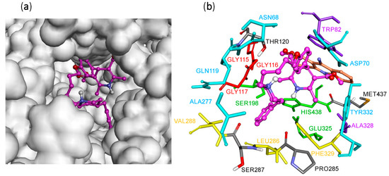 The docking results also reveal that BuChE could effectively accommodate compound 3c inside the active site gorge. The ligand is placed into the binding pocket in a similar way to compound 3h (docking score = −8.7 kcal/mol) (Figure 5a). In this situation, one carboxylate group and the dihydropyridine moiety of the docked ligand were superimposed onto the native co-crystallized tacrine. The NH group, oriented toward the bottom of the active site, forms a hydrogen bond and van der Waals interaction with the catalytic triad residues His438 and Ser198, respectively. Moreover, methyl of the carboxylate groups interacts with Trp82 and Ala328 (CBS pocket), with Phe329 (ABP) and with Tyr332 (PAS). The carboxylate group also interacts with Gly115 and Gly116 (OH) (Figure 6a).