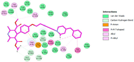 The protein complex with the best-docked pose of compound 3h showed that both carboxylate groups of the docked ligand were superimposed on the native co-crystallized tacrine (Figure 3b). In this position, the dihydropyridine moiety is oriented toward the bottom of the active site, as with tacrine, and it binds in the catalytic anionic site (CAS) region of the enzyme, establishing π–alkyl, alkyl and carbon hydrogen interactions with many amino acids, including two key amino acids of the choline binding site (CBS) pocket (Trp82 and Ala328). The phenoxy–alkyl linker chain went from the bottom to the mouth of the gorge, allowing the benzyl–piperidinium moiety to enter the cavity again. In this situation, π–anion interaction is established between Asp70 (peripheral anionic site, PAS) and the phenoxy ring. In addition, the alkyl chain also interacts with Asn68 (PAS) via van der Waals contacts (Figure 4).