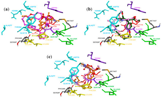 Docking pose of compounds 3c, 3d, 3h and 3k-3m inside gorge cavity of hBuChE. (a) Compound 3h is shown in pink, compound 3c in orange. (b) Compound 3l is shown in green, compound 3m in light violet. (c) Compound 3d is shown in orange, compound 4k in light pink. All compounds are represented in ball and stick models, CAS in green, OH in red, CBS in violet, ABP in yellow, and PAS in blue.