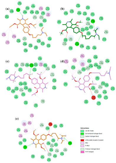 Two-dimensional schematic view of the interactions between 3c (a), 3l (b), 3m (c), 3k (d), 3d (e) and hBChE.