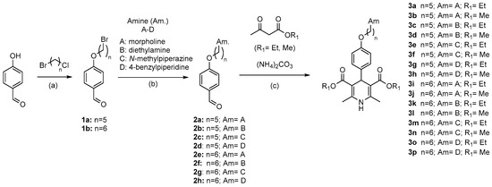 Synthesis of dialkyl 2,6-dimethyl-4-(4-((5-aminoalkyl)oxy)phenyl)-1,4-dihydropyridine- 3,5-dicarboxylate 3a-p. Reagents and conditions: (a) K2CO3, acetonitrile, 18 h, reflux; (b) K2CO3, acetonitrile, 24 h, reflux; (c) EtOH/H2O, O.N., 75 °C.