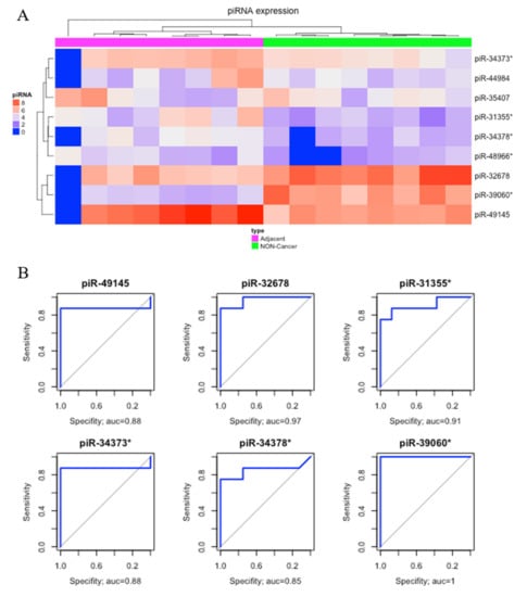 | piR-39060 * | −4.27 | 1.92 × 10−17 | 3.21 | 3.62 × 10−4 | ||