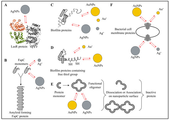 Schematic representation of various interactions between gold or silver nanoparticles and biofilm proteins. (A) The metallic nanoparticles (e.g., silver nanoparticles) interact with few proteins that are involved in quorum sensing (e.g., LasR) via electrostatic, hydrophobic and hydrogen-bonding interactions. In this case, nanoparticles and their ions preferentially interact with amino acids at ligand binding sites, making them inactive for cell signaling. (B) Gold and silver nanoparticles also interact via electrostatic, hydrophobic and hydrogen-bonding interactions with amyloid-forming proteins such as FapC, sequester its monomers and create defects in bacterial cell structure. (C) Several metabolic proteins and enzymes in the biofilm interact with nanoparticles via electrostatic, hydrophobic, hydrogen-bonding, Van der Waals and π–π interactions, causing collapse in the protein structure and eventually making them inactive for metabolism. (D) Gold nanoparticles and gold ions show strong Au-S bonding interactions while interacting with thiol-containing proteins of the biofilms. (E) Gold and silver nanoparticles also interact with functional oligomers of certain proteins via electrostatic and hydrophobic interactions and lead to their association or dissociation, which ultimately leads to impairment in their function in the biofilm. (F) Membrane proteins (e.g., electron transport system) also have similar interactions with metal ions and metallic nanoparticles that leads to loss in integrity and changes in membrane protein functions. Red arrows in the figure indicate all types of interactions.