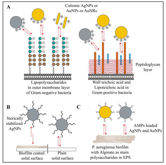 Schematic representation of interactions between gold or silver nanoparticles and polysaccharides of biofilm. (A) Bacterial polysaccharides (LPS, teichoic acid and lipoteichoic acid) show electrostatic interactions, hydrogen-bonding interactions and hydrophobic interactions with cationic gold and silver nanoparticles. Neutral and anionic gold and silver nanoparticles show no or minimal interactions under the same experimental conditions. (B) In some cases, the nanoparticles stabilized with large, non-ionic polymers (e.g., PVP coated AgNPs) show specific electrosteric repulsive interactions with biofilm polysaccharides. (C) Antimicrobial peptide coated gold and silver nanoparticles show electrostatic as well as hydrophobic interactions with biofilm polysaccharides (e.g., alginate in P. aeruginosa biofilm). Red arrows in the figure indicate all types of interactions.