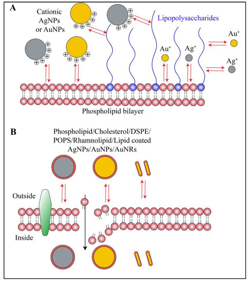 Schematic representation of interactions between biofilm lipids and gold or silver nanoparticles. (A) Cationic gold nanorods, gold nanoparticles and silver nanoparticles along with their respective ions interact with biofilm lipid and lipopolysaccharides via electrostatic and hydrophobic interactions. Whereas, anionic or neutral nanoparticles or nanorods show minimal or no interactions at all. (B) Gold nanorods, gold nanoparticles and silver nanoparticles coated with lipid moiety or any other hydrophobic moiety preferentially show hydrophobic interactions with biofilm lipids. Red arrows in the figure indicate different types of interactions.