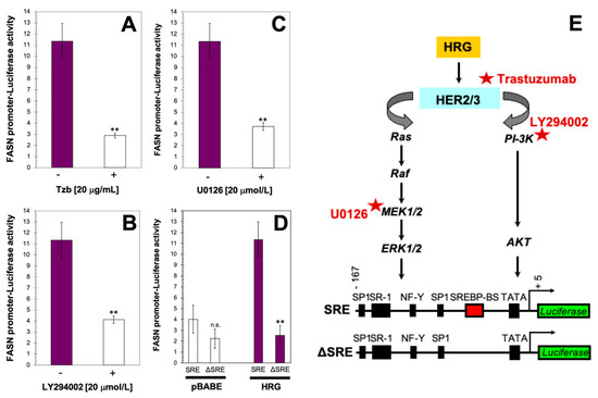 PI-3K/AKT and MAPK ERK1/2 signaling cascades mediate heregulin-driven activation of FASN gene expression in a SBREP-dependent manner. MCF-7/HRG cells were transiently transfected with a plasmid containing a Luciferase reporter gene driven by a 178-bp FASN gene promoter fragment harboring a SREBP-binding site, flanked by auxiliary NF-Y and Sp-1 sites. The next day, cells were treated with 20 μg/mL of trastuzumab (Tzb) (A), LY294002 (B), or U0126 (C). Alternatively, MCF-7/pBABE and MCF-7/HRG cells were transiently transfected with a plasmid containing a Luciferase reporter gene driven by a 178-bp FASN promoter fragment harboring a SREBP-binding site or with a similar construct with the SREBP-binding site deleted (D). After 24 h, cells were lysed and Luciferase activity was measured. Luciferase assays were performed as previously described [19,20]. Each experimental value represents the mean fold increase (columns) ± S.D. (bars) from at least three separate experiments in which triplicate wells were measured. ** p < 0.005; n.s. not statistically significant. (E) HRG-triggered regulatory cascade actively links upstream HER2 transactivation and increased activation of PI-3K/AKT-MAPK/ERK1/2 signaling transduction with downstream (SREBP-dependent) transcriptional activation of the FASN gene promoter.