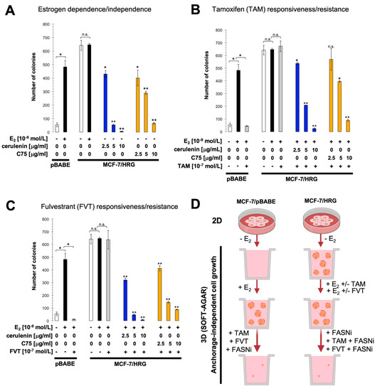 Pharmacological inhibition of FASN activity impedes estrogen-independent and antiestrogen-refractory cell growth of MCF-7/HRG cells. Estradiol (E2)-depleted cells were plated in soft agarose containing E2 (10−9 mol/L) (A), cerulenin (2.5, 5, and 10 μg/mL), C75 (2.5, 5, and 10 μg/mL), tamoxifen (10−7 mol/L) (B), fulvestrant (10−7 mol/L) (C), their combinations, or ethanol (v/v) or DMSO (v/v) vehicle only for 7–10 days. Colony formation (≥50 μm) was assessed using a colony counter. Each experimental value represents the mean colony number (columns) ± S.D. (bars) from at least three separate experiments in which triplicate dishes were counted. (* p < 0.05; ** p < 0.005; n.s. not statistically significant). (D) Pharmacological inhibition of FASN activity blocked the estradiol-independent and tamoxifen/fulvestrant-refractory ability of MCF-7/HRG cells to anchorage-independently grow in soft-agar. FASNi: FASN inhibitor; TAM: Tamoxifen; FVT: Fulvestrant;º 2D: Two-dimensional; 3D: Three-dimensional.