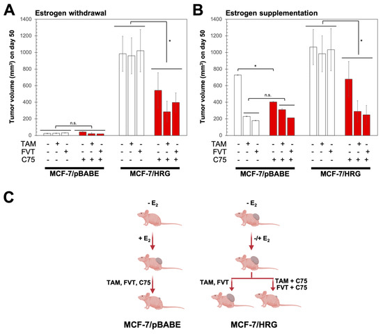 FASN inhibition restores anti-tumor activity of tamoxifen and fulvestrant against MCF-7/HRG tumors. Mean tumor volumes (mm3) (columns) ± S.D. (bars) on day 50 of MCF-7/pBABE and MCF-7/HRG xenograft tumors in athymic female mice treated with the FASN inhibitor C75 in the absence (A) or presence (B) of estrogen, tamoxifen (TAM), and/or fulvestrant (FVT) (n = 10 mice/experimental group). (C) In vivo treatment with the FASN inhibitor C75 restores the anti-tumor activity of TAM and FVT against hormone-resistant MCF-7/HRG xenograft tumors in mice.