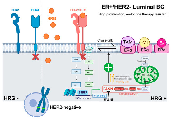 Here, using MCF-7 cells engineered to stably overexpress HRG as an experimental model of estrogen-independent cancer cell growth and endocrine resistance, we evaluated the autocrine capacity of HRG-driven HER2/HER3 signaling to stimulate FASN expression as part of the endocrine resistance program that is activated in certain subgroups of ER+ breast carcinomas. We present evidence that FASN is a key enabler for endocrine resistance in HRG+/HER2− breast cancer and highlight the therapeutic potential of FASN inhibitors for the treatment of endocrine therapy-resistant luminal B-like breast cancer.