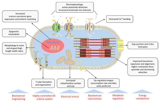 Human iPSC-CMs are used in modeling inherited cardiac diseases for numerous translational applications, and make it possible to investigate their pathology for the discovery of novel therapeutic agents. Currently, many current disease models have difficulties in recapitulating disease phenotypes due to the inherent immaturity problem []. There has been exciting progress in recent maturation strategies of iPSC-CM, including in the engineering of biophysical cues, hormone intervention, regulation of signaling pathway, and other metabolism manipulations (Figure 1). The physiological contractile force and upstroke velocity are still lower than those of the adult myocardium, and the molecular mechanism of stimuli cues in cardiac maturation has yet to be elucidated. Therefore, the ideal solutions tend to develop combined stimuli methods to manipulate CM maturation, thereby addressing the scalable and functional demand for clinical use [,].