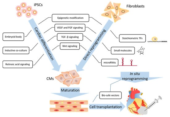 Ischemic heart disease often leads to congestive heart failure, which is the leading cause of death worldwide. The adult mammalian heart has minimal capacity to generate the contractile cells lost after ischemic injury, and they are replaced with circulatory deficient scar formations as part of the normal heart remodeling process. Recent efforts have been devoted to the development of heart regeneration therapeutics, but stem cell transplantation protocols (such as MSC) have failed to restore structural and functional integrity in affected patients []. Encouragingly, induced pluripotent stem cells (iPSCs) can give rise to a number of transplantable cardiac contractile cells to potentially replenish the compromised endogenous cardiomyocyte pool []. In addition, patient-specific iPSCs contain genetic information of inherited heart diseases, allowing for a more accurate study of pathological mechanisms []. Recent developments in which fibroblasts are directly converted into cells with cardiomyocyte-like phenotypes and functions (direct reprogramming) can be applied to bypass pluripotency, and offer another promising approach for myocardial regeneration. In this review, we provide insights into the development of cardiac regenerative approaches using iPSCs and direct reprogramming of fibroblasts, and conclude with the major advancements in improving cardiomyocyte induction efficiency and maturation.
