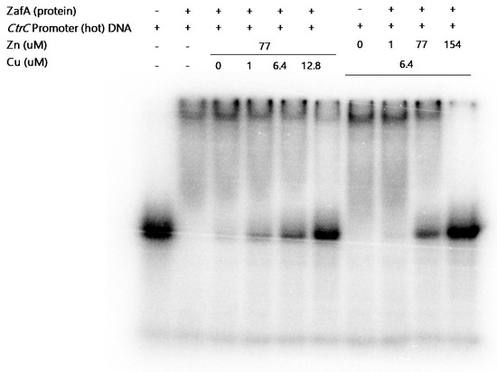 2.4. ZafA Binds to the ZafA Binding Motif of the CtrC Promoter Region, and the Binding Affinity Is Inversely Related to Zinc and Copper Concentration