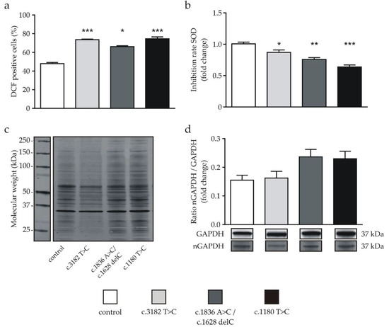 ROS were measured using the fluorescent dye DCF, which is formed from H2DCF upon contact with ROS. In addition, we determined propidium iodide (PI)-positive cells reflecting necrotic or apoptotic cells in the examined population. Only PI-negative cells and DCF-positive cells displayed in the lower right quadrant (Supplementary Figure S1a,b) were included in the evaluation. In accordance with recent studies [13,14], we found significantly higher ROS levels in each of the NPC1-deficient cell lines compared to the control (Figure 1a). As a further indicator of OS, SOD activity was significantly decreased in all NPC1-deficient cell lines in comparison to the control cell line (Figure 1b). Western blot analysis revealed a distinct pattern of proteins with nitrated tyrosine residues (Figure 1c). Although the identity of these particular proteins remains to be determined, the band pattern of nitrated proteins differs between the cell lines (Figure 1c), indicating that NPC1-deficient cells suffer from oxidative stress. In the control and the c.3182 T > C cells, the majority of the bands were detected between 37–75 kDa, while, in the cell lines c.1836A > C/c.1628 delC and c.1180 T > C, the bands were more pronounced and spread out from 20 to 200 kDa. To quantify the amount of nitrated proteins, we analyzed glycerinealdehyd-3-phosphat-dehydrogenase (GAPDH), which is known to undergo nitration of tyrosine residues [30]. We found a higher ratio of nitrated GAPDH (nGAPDH) to total GAPDH in the cell lines carrying the c.1836 A > C/c.1628 delC and c.1180 T > C mutations, although the differences were not statistically significant (Figure 1d).