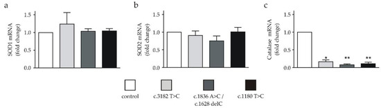 mRNA expression of SOD1, SOD2 and catalase in neuronal differentiated cells. (a) SOD1 mRNA and (b) SOD2 mRNA expressions in NPC1-deficient cell lines were not different in comparison to the control (n = 5 or 6). (c) All NPC1-deficient cell lines showed a significantly lower expression of catalase mRNA (n = 6). * = p < 0.05 and ** = p < 0.01. Statistical tests used: (a–c) one-way ANOVA with Kruskal-Wallis multiple comparisons test. See also the Materials and Methods section.
