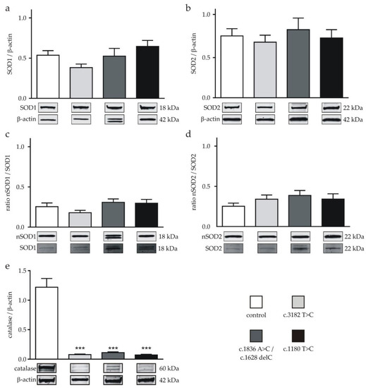 Next, we analyzed the expressions of SOD1, SOD2, the ratio of nitrated fractions (nSOD1 and nSOD2) and catalase by Western blot to reveal correlations between the mRNA levels and protein levels of the corresponding enzymes. In none of the cells carrying a NPC1 mutation, we found a significant alteration of the SOD1 or SOD2 protein levels (Figure 3a,b). The same observation was made for the ratio of nSOD1 and nSOD2 to the respective total protein amount. None of the NPC1-deficient cell lines displayed an altered ratio in comparison to the control (Figure 3c,d).