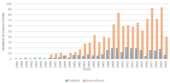 This study assumes a review of world scientific literature. An online search was conducted using the scientific databases PubMed and ScienceDirect applying the key words head and neck paraganglioma and genetics. The first resulting article in PubMed dated from 1981 and from 1996 in ScienceDirect. Over the last 10 years, the number of articles on the subject has doubled. While this review considers articles from the last 20 years, over 85% of them were published in the last 10 years. Detailed data concerning the number of articles in each year are presented in Figure 1.