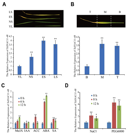 Via a BLAST search against the wheat protein database in the Ensembl Plants website (http://plants.ensembl.org/index.html) using the OsNAP protein sequence as a query, we obtained a wheat NAC transcriptional factor homologous to the senescence regulator NAP (Figure S1), previously named TaSNAC11-4B [51]. To investigate the potential roles of TaSNAC11-4B in wheat leaf senescence, we performed qRT-PCR to analyze its expression profiles at different development stages in flag leaves. The results indicated a significant increase in TaSNAC11-4B expression at early stages of leaf senescence (Figure 1A). Within a single flag leaf undergoing senescence, the expression of TaSNAC11-4B increased from the younger base to the yellowing tip (Figure 1B). Given that NAP TFs as well as a number of other NAC TF family members have been shown to be involved in stress responses [27,35,52,53], we examined the expression of TaSNAC11-4B in detached leaves after treatment with phytohormones ABA, MeJA, 1-aminocyclopropane-1-carboxylic acid (ACC), salicylic acid (SA), indole-3-aceticacid (IAA), and stressors including NaCl and drought (PEG6000 mimic). Expression of the TaSNAC11-4B gene was induced by all the senescence-promoting phytohormones, ABA, JA, ethylene, and SA, with an increase of more than sixfold 12 h after ABA treatment (Figure 1C). In addition, TaSNAC11-4B expression was significantly induced by both NaCl and PEG6000 treatments. Based on the results of expression analyses, we propose that TaSNAC11-4B likely plays a role in age-dependent and stress-induced leaf senescence in wheat.