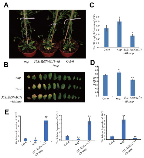 Complementation of Arabidopsis nap null plants with TaSNAC11-4B. (A) Phenotypes of 5-week-old whole plants of Col-0, nap null mutant, and a complementation line. (B) Phenotypes of individual rosette leaves of Col-0, nap null mutant, and the complementation line. (C,D) Chlorophyll content and Fv/Fm ratio of the sixth leaf from plants of different genotypes. (E) Expression of senescence marker genes in Col-0, nap mutant, and complementation line. Asterisks indicate statistically significant differences (* p < 0.05; ** p < 0.01) using a Student’s t-test. Three independent experiments were performed.