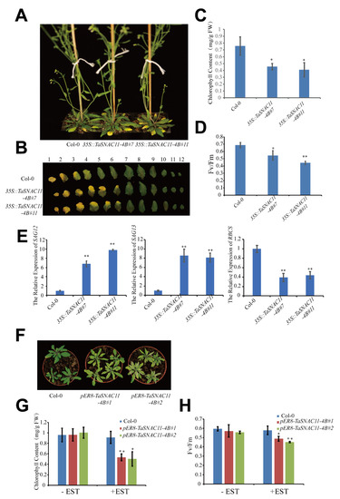 To further confirm the results of the overexpression study, we used a chemical-inducible overexpression strategy in which pER8-TaSNAC11-4B was generated to transform Arabidopsis to obtain β-estradiol (EST)-inducible gain-of-function transgenic lines. Treatments with 10 μM EST of plants of two independent lines, pER8-TaSNAC11-4B#1 and pER8-TaSNAC11-4B#2, but not of Col-0, caused induced expression of TaSNAC11-4B (Figure S3). Precocious leaf yellowing and a significant reduction in chlorophyll content and Fv/Fm ratio were observed in plants with induced expression of TaSNAC11-4B (Figure 3F–H).