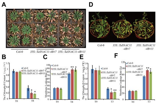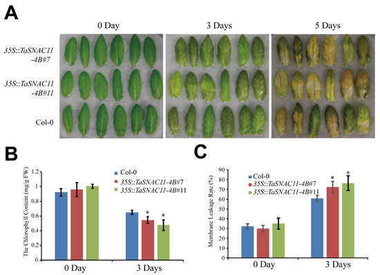 Considering that the expression of TaSNAC11-4B was up-regulated by ABA and drought, we investigated the senescence phenotype of TaSNAC11-4B overexpression lines under drought conditions. Six-week-old plants were subjected to water deficit treatments for 10 days and significantly more wilting and yellowing were observed in plants of 35S::TaSNAC11-4B#7 and 35S::TaSNAC11-4B#11 than that of Col-0 (Figure 4A). The results of chlorophyll content analysis were consistent with the visible phenotype (Figure 4B). Stress conditions often compromise the integration of plant cell membranes, leading to ion leakage [54,55]. After water deficit treatments, leaves of TaSNAC11-4B overexpression lines displayed significantly higher membrane leakage rates than that of Col-0 (Figure 4C), demonstrating that expression of TaSNAC11-4B indeed led to higher sensitivity to drought stress.